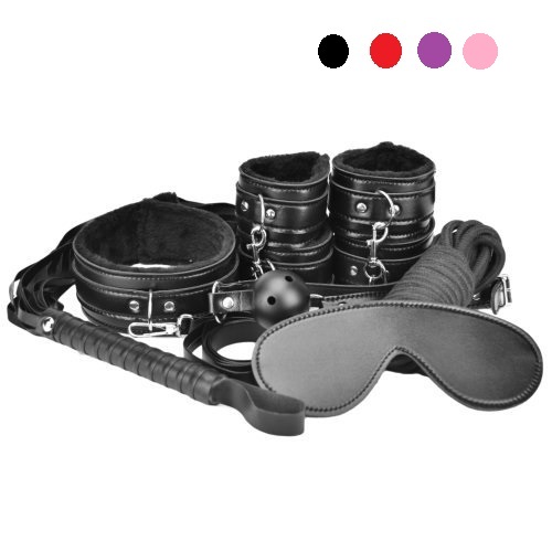 Kit de cuero vegano forrado en color morado, rojo, rosa o negro bdsm. Con suave peluche por su parte interior y compuesto por 8 piezas.